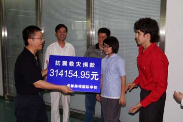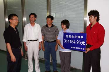 5月28日下午,林華玉校長率學(xué)生、教師、行政管理人員代表,將全校師生為災(zāi)區(qū)募捐的314454.95元送到成都高新區(qū)慈善會。