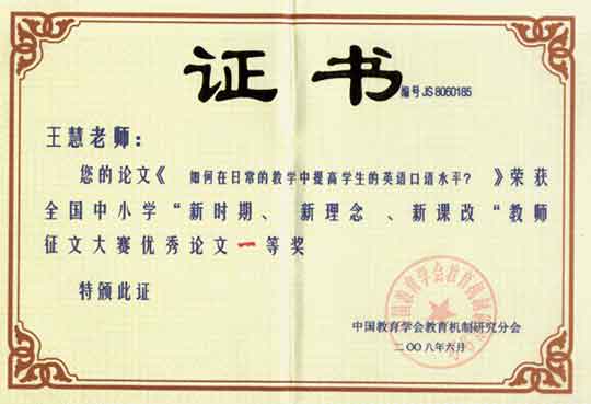 王慧老師的論文《如何在日常的教學(xué)中提高學(xué)生的英語口語水平?》榮獲全國中小學(xué)“新時期、新理念、新課改”教師征文大賽優(yōu)秀論文一等獎