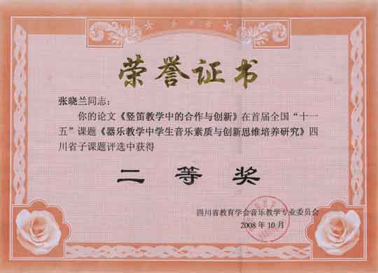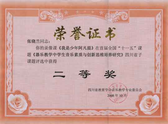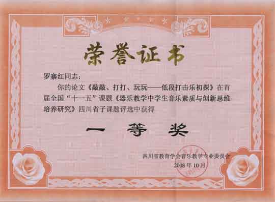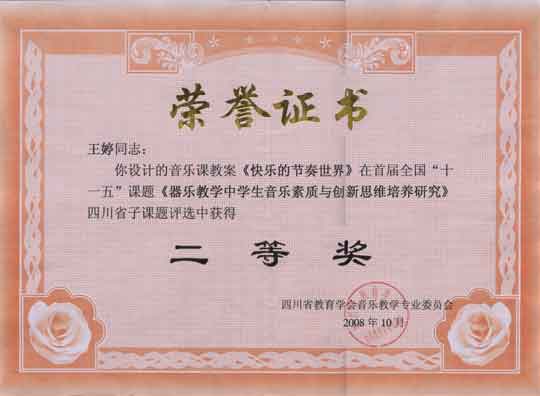 張曉蘭、王婷、羅寨紅在首屆全國“十一五”課題《器樂教學中學生音樂素質(zhì)與創(chuàng)新思維培養(yǎng)研究》四川省子課題評選中獲獎