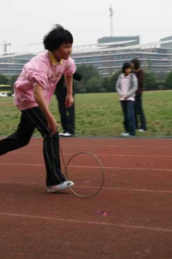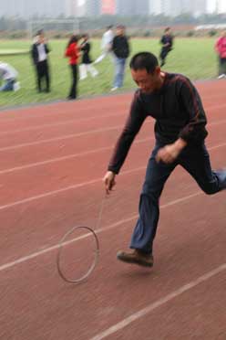學(xué)生、家長滾鐵環(huán)接力比賽