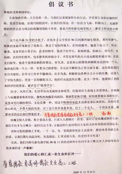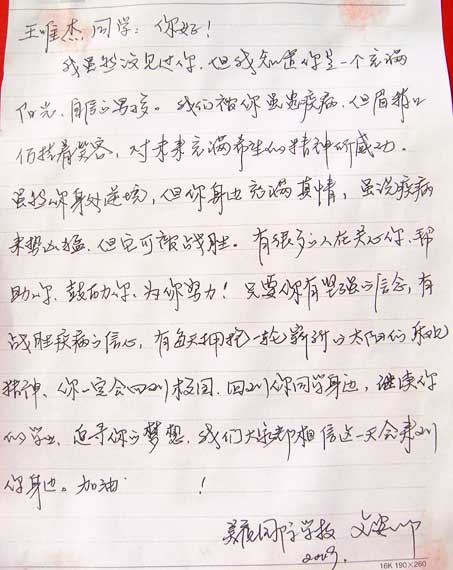 這是一個(gè)感人的畫卷,一個(gè)病痛,八方支援。學(xué)生發(fā)出倡議書,集資善款;校長寫去激勵(lì)信,鼓舞心田。善款不多,卻是愛的傳遞。兩個(gè)同時(shí)代的聲音高歌藍(lán)天——愛,能戰(zhàn)勝一切。家長的感謝信,行行淚濺;校長的激勵(lì)信,無限溫情,播種陽光。相信,王唯杰同學(xué),戰(zhàn)勝病痛,我們一起共擁明天。