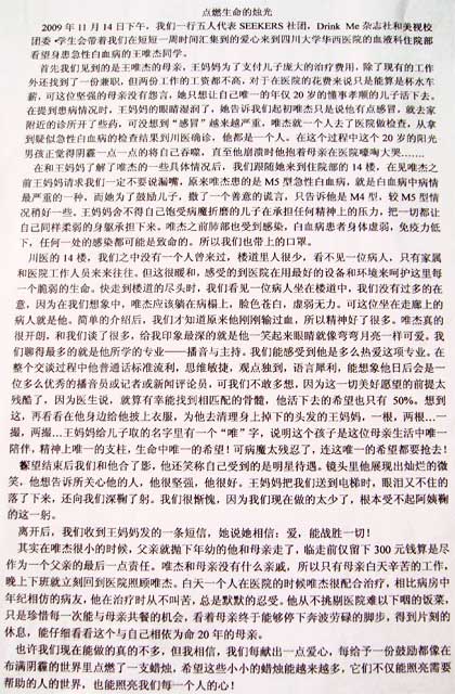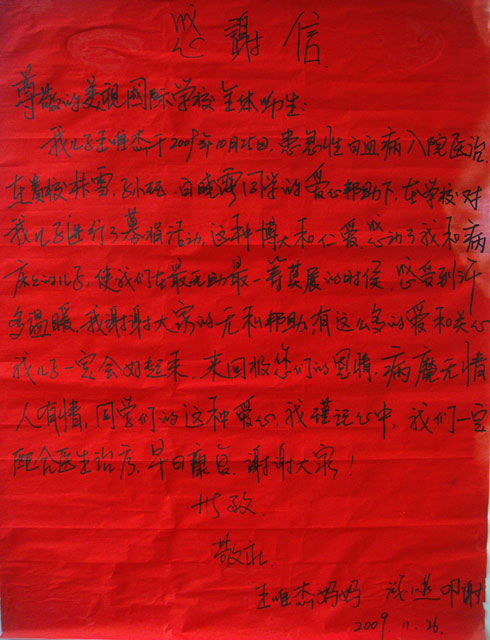 王唯杰媽媽寫給學(xué)校學(xué)生的感謝信
