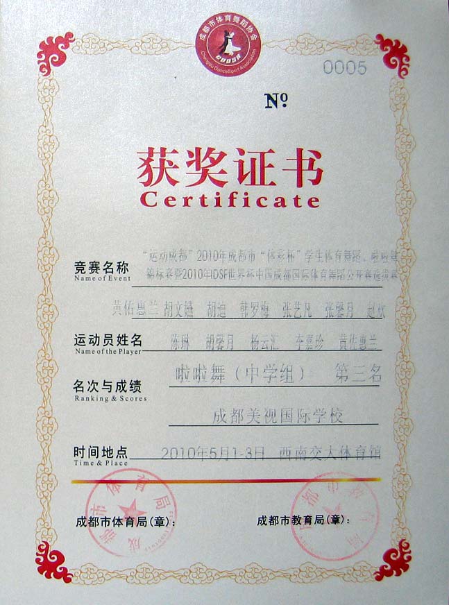 黃佑惠蘭、胡文嬿等同學榮獲"運動成都"2010年成都市"體彩杯"學生體育舞蹈、啦啦舞錦標賽