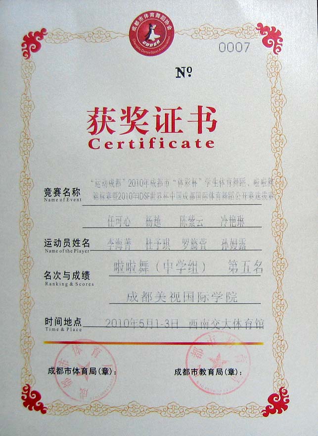 任可心、楊越等同學(xué)榮獲"運(yùn)動(dòng)成都"2010年成都市"體彩杯"學(xué)生體育舞蹈、啦啦舞錦標(biāo)賽