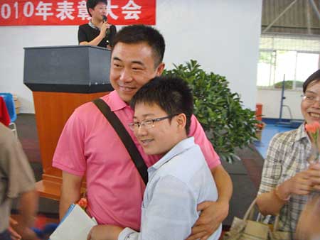 表彰大會(huì)上還有一幕特別地令人難以忘懷——大會(huì)主持人邀請學(xué)生的家長上臺接受孩子的感恩!當(dāng)孩子們把手中的鮮花獻(xiàn)給父母的時(shí)候,當(dāng)孩子懂事地?fù)肀Ц改傅臅r(shí)候,臺上臺下的時(shí)空像是被親情凝固了——有的家長笑得很開心,有的家長噙著淚水,有的家長任由眼淚奔放,有的家長與孩子緊緊相擁……