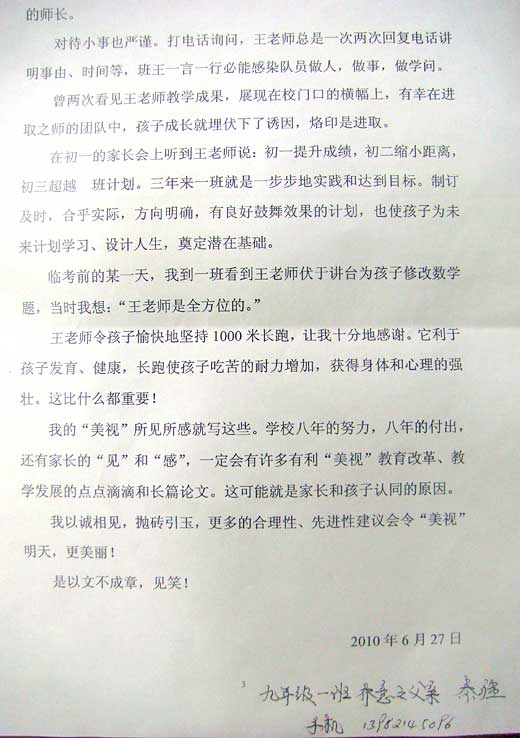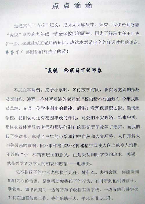 下面是九年級(jí)(1)班喬意之同學(xué)的父親秦疆先生在女兒畢業(yè)后寫(xiě)給中學(xué)部校長(zhǎng)文安娜女士的一封以《點(diǎn)點(diǎn)滴滴》為題的信,借以表達(dá)對(duì)初三年級(jí)全體老師的感謝之情。信的全文如下:
