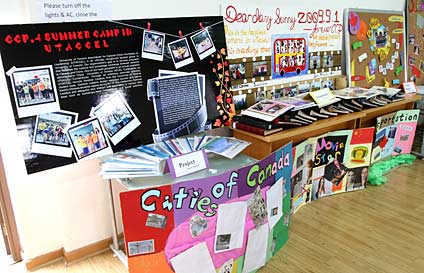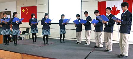 上午10:30,在林校長等領(lǐng)導(dǎo)的陪同下,陳金滿一行在融合部階梯教室參觀了中加班同學(xué)制作的反映他們學(xué)習(xí)、生活和活動的圖片展,欣賞了中加班同學(xué)精心準(zhǔn)備的節(jié)目。幽默搞笑的歷史話劇《荊柯刺秦王》、沁人心脾的合唱《LEMAN TREE》、輕松活潑的《BEAUTY IN THE WORID》等節(jié)目,展示了中加班同學(xué)的才藝,表達(dá)了我們對客人的熱誠。同時學(xué)生們的演講,展示了他們的理想,以及對未來的憧憬。