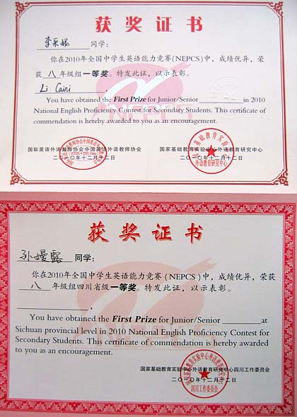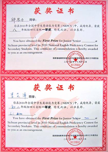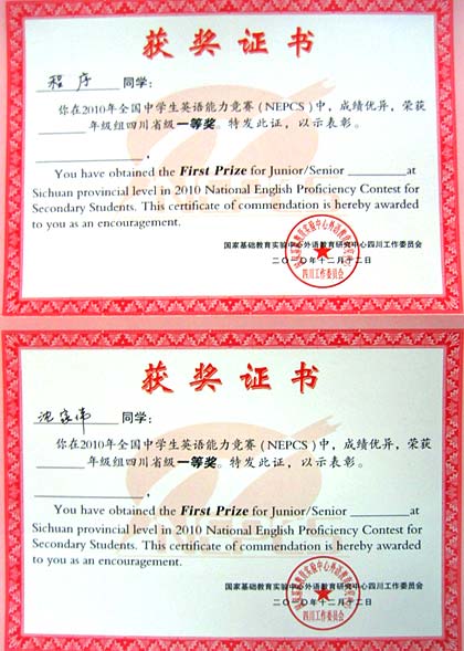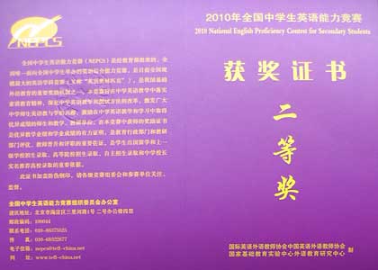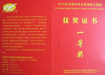美視學(xué)子在2010年全國中學(xué)生英語能力競賽(NEPCS)中獲獎(jiǎng)