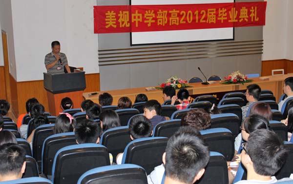 6月30日上午,美視高中2012屆畢業(yè)典禮在我校學(xué)術(shù)廳隆重舉行。中學(xué)部校長(zhǎng)上臺(tái)致辭,祝賀畢業(yè)生們圓滿完成學(xué)業(yè),隨后學(xué)生代表、家長(zhǎng)分別上臺(tái)講話,共同述說(shuō)對(duì)美視和老師們難忘的點(diǎn)滴之情。