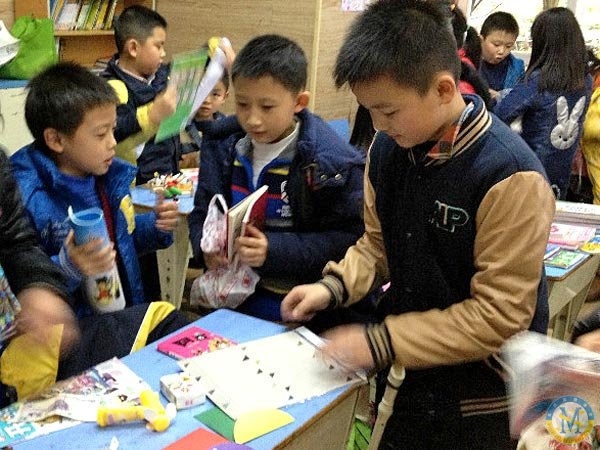 接下來四年級五班做顧客了。來到三3班教室一看,呵,好家伙,除了書桌上擺滿了東西外,還有一個地攤!地攤上全是書,三個攤主正扯著嗓子喊:“走過路過,千萬不要錯過!”,愛書的孩子們立馬圍了上去。來看熱鬧的悅爾媽和家鈺媽也被熱鬧的氣氛所感染,忍不住參與進來買東西!藍淇好用好不容易賺來的5元錢買了一個發(fā)夾,立馬戴在了頭上。藝天跑來申請:“我回教室拿一下口袋,我買的東西實在太多了!”……20分鐘很快就過去了,四年級五班的孩子滿載而歸,一路興奮地說:“他們的東西好便宜哦!”