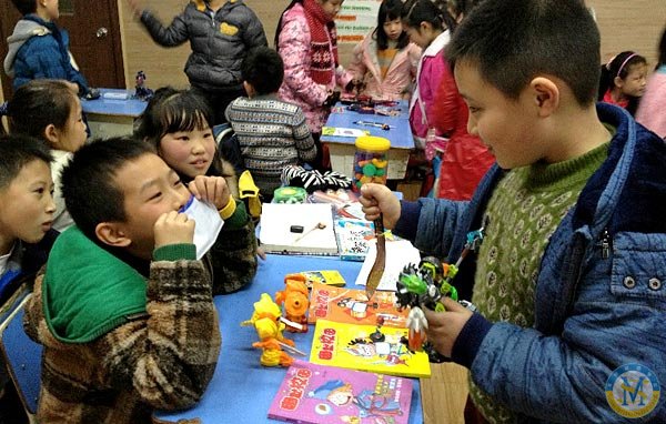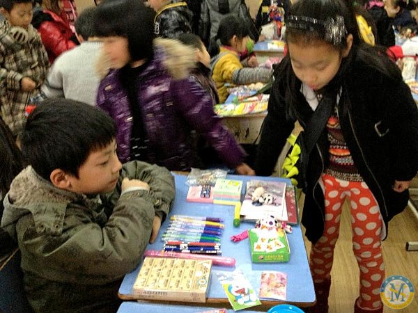 12月18日,小學部三年級三班和四年級五班的同學們開展了一次別開生面的跳蚤市場活動。首先是四年級五班的孩子當老板,三年級的孩子當顧客。孩子們先花了差不多一節(jié)課來做準備,比如復習和買賣有關的英語句子、交代注意事項、布置教室等。準備停當后,三年級的孩子們就到了。在禮節(jié)性的掌聲后,教室里立馬沸騰了。頓時,叫賣聲、討價還價、笑聲充斥了整個教室。呂佳隆的攤位最受人歡迎,一下子圍滿三3班的小同學,短短幾分鐘,他就賣斷了貨,收獲了近300元人民幣!