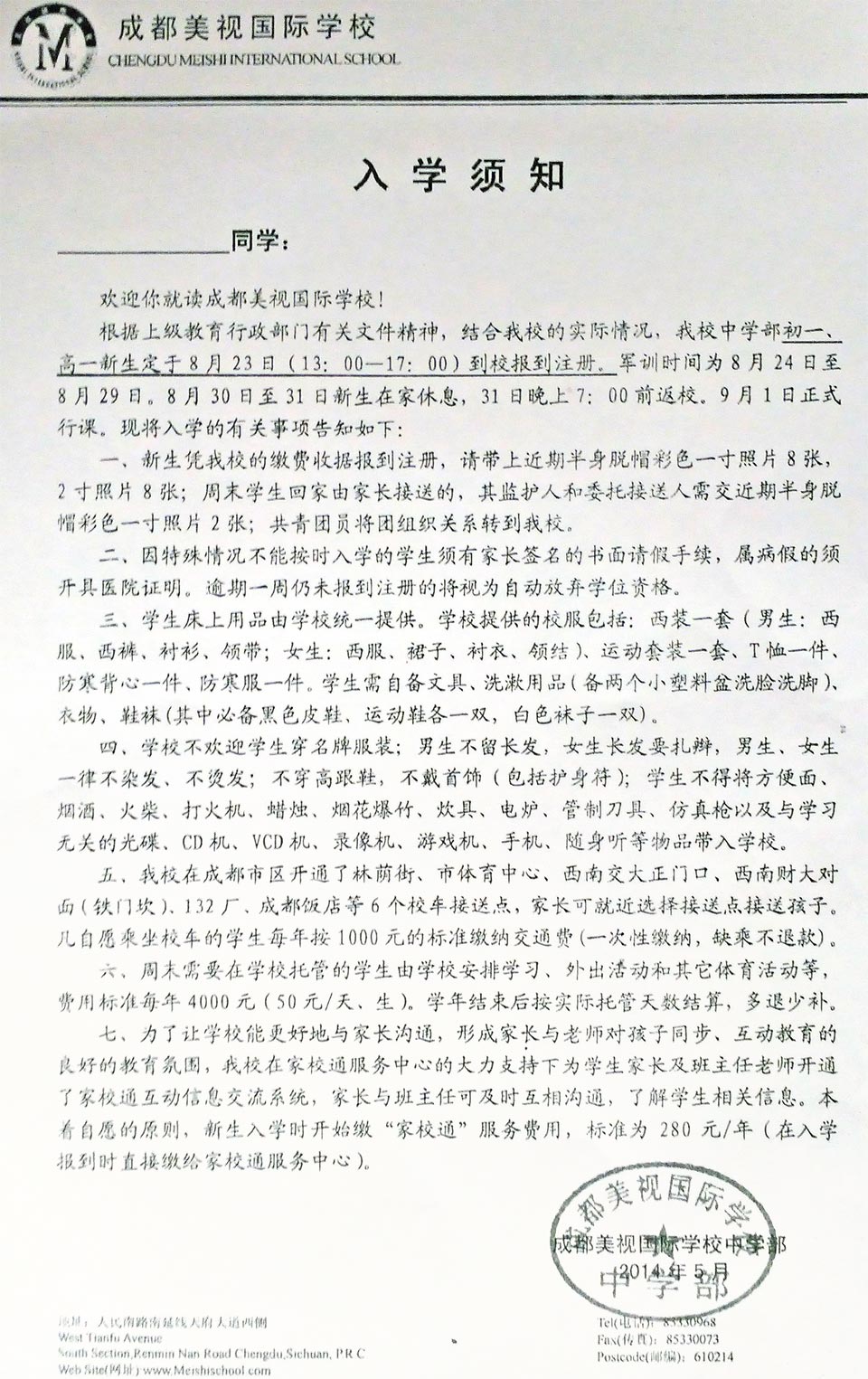 成都美視學(xué)校中學(xué)部入學(xué)須知