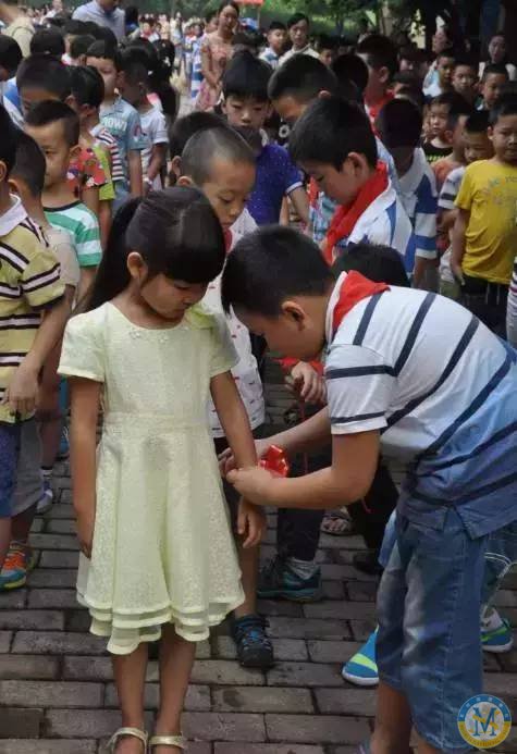 緊接著,四年級的哥哥、姐姐們?yōu)樾碌矫酪暤囊荒昙壍艿堋⒚妹脗兇魃狭四嵌漉r艷的小紅花。