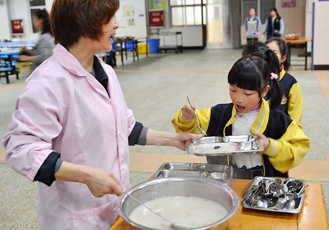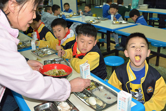 食堂的阿姨正認(rèn)真地幫孩子們分早餐。