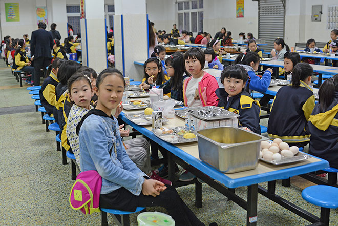看,孩子們井然有序地領(lǐng)取餐盤進(jìn)餐。