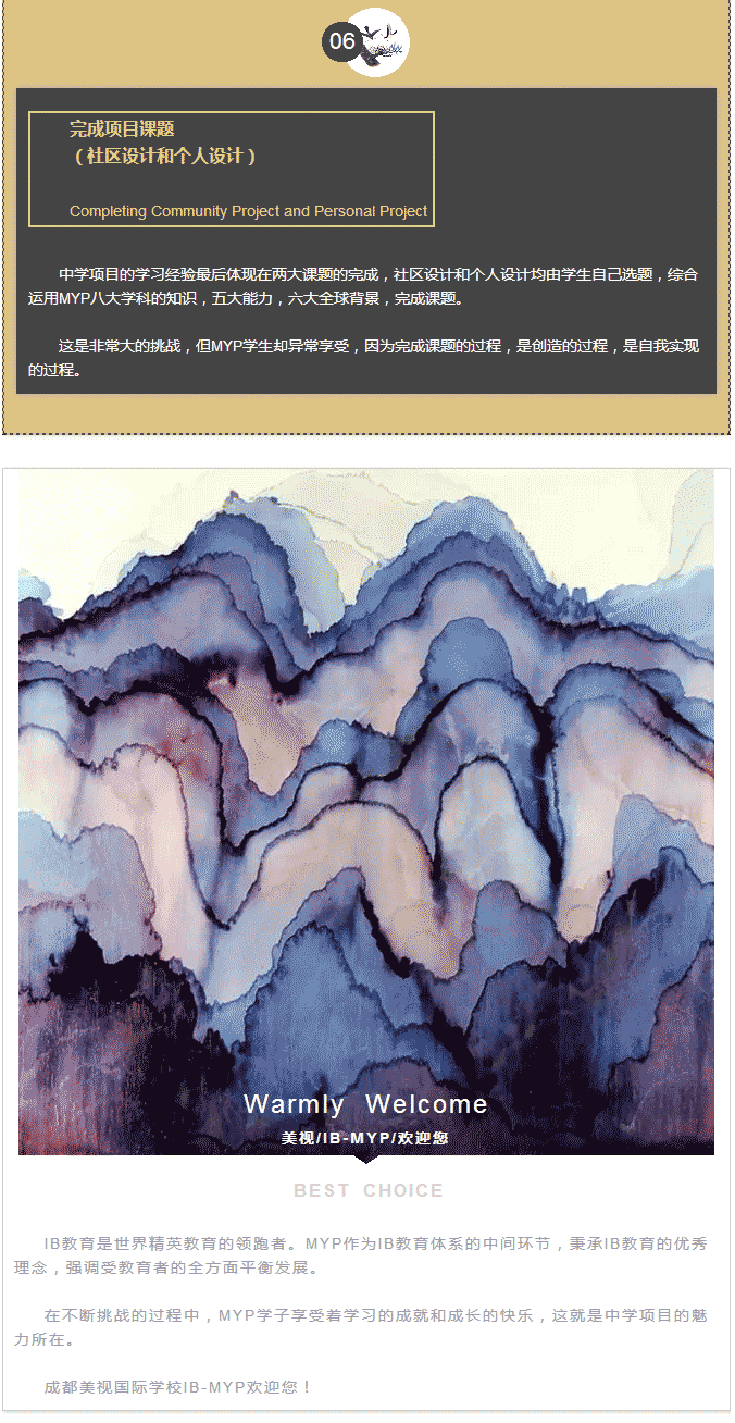 成都美視學校于2016年7月獲得IB-MYP授權,成為西南地區(qū)唯一 一所實施MYP教學的IB世界學校。