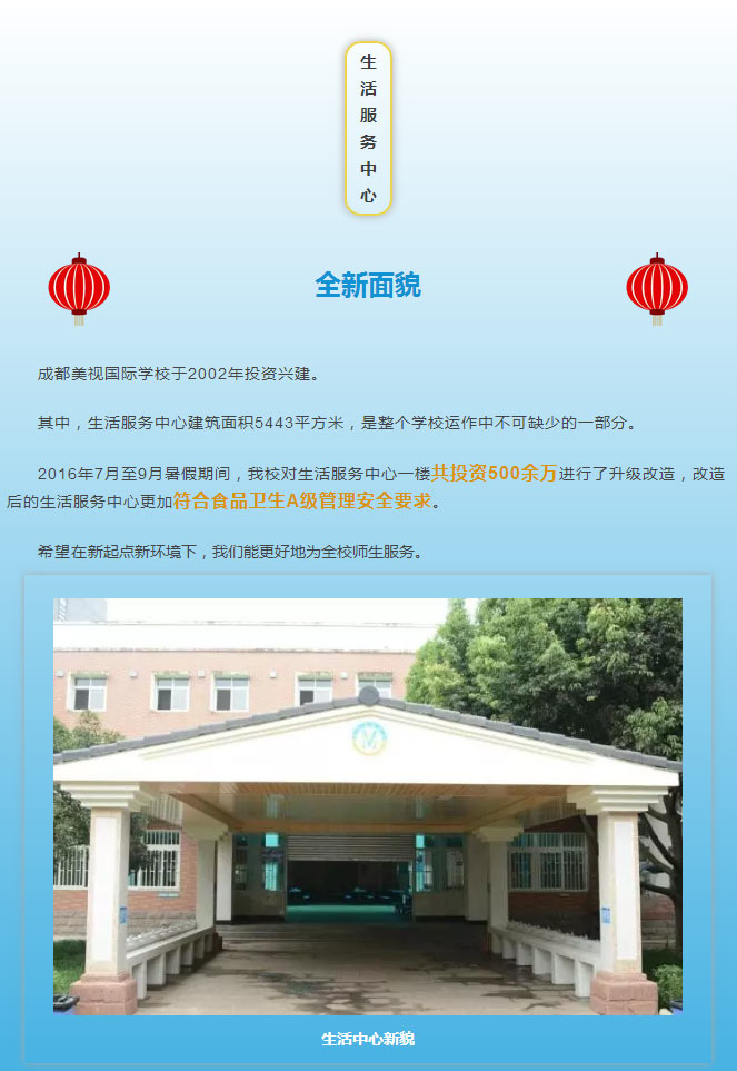 2016年暑假期間,美視生活中心從原料驗(yàn)收、庫房管理、原料加工、烹調(diào)操作、配餐管理、餐用具洗滌管理、廚房透明式管理等方面進(jìn)行了整體系統(tǒng)的布局。