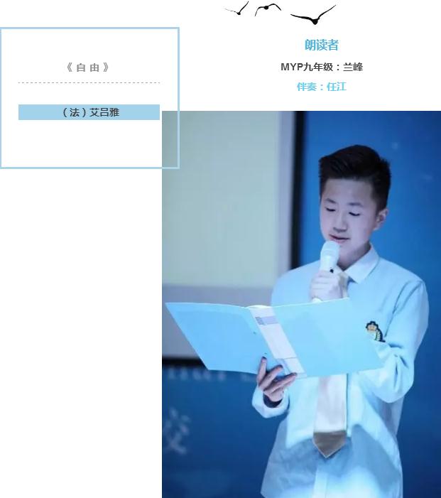 在九年級(jí)的蘭峰同學(xué)心中,朗讀可以用來宣泄自己內(nèi)心的情感,因此他選擇法國詩人艾呂雅的《自由》來表達(dá)自己內(nèi)心對“自由”的呼喚。