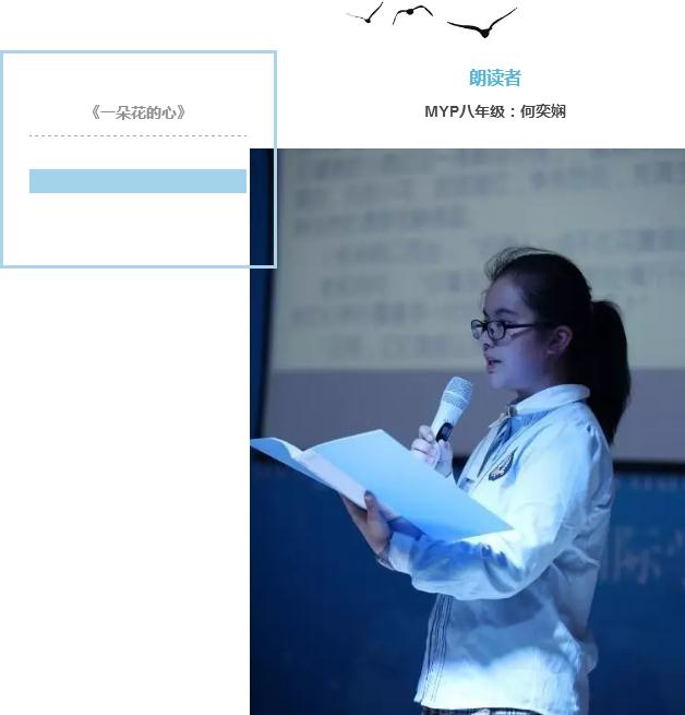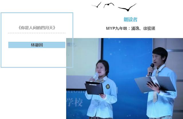 至此,三期MYP項(xiàng)目《美視朗讀者》已經(jīng)圓滿落下帷幕。從老師到家長,到學(xué)生,難忘那一首首一篇篇,一聲聲一句句,還在這春意闌珊的校園蕩漾,從朗讀者口中,直到每個(gè)人心中,正是那最美的人間四月天。