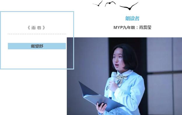 在她的朗讀聲中,朦朧而又幽深的雨巷里走來一位像丁香一樣結(jié)著愁怨的姑娘, 那份既迷惘感傷又滿是期待的情懷,著實(shí)感染了現(xiàn)場所有觀眾。