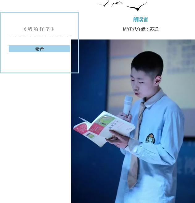 八年級(jí)的蘇適同學(xué)來自北京,他將祥子在暴雨中艱難拉車的場景朗讀給大家,他用純正的北京口音給片段描寫帶上了濃濃的京腔京韻,博得陣陣喝彩。