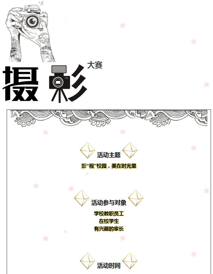 所有參賽作品應(yīng)結(jié)合本次攝影比賽主題,圍繞校園風(fēng)景、教學(xué)、生活場景、學(xué)校組織的個(gè)人或集體活動(dòng)。