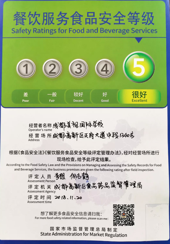 12月14號,高新區(qū)食品安全監(jiān)督管理局正式向美視師一學(xué)校頒發(fā)了“餐飲服務(wù)食品安全等級5級”證書。