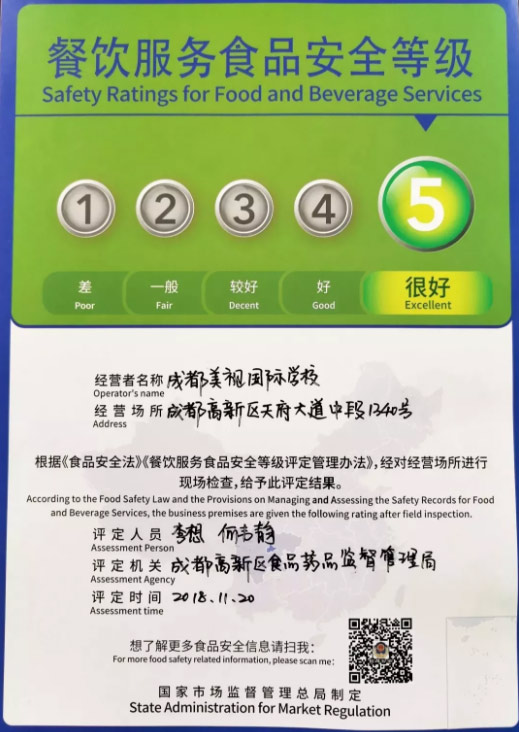 2018年12月,成都市高新區(qū)食品藥品監(jiān)督管理局正式向美視頒發(fā)了餐飲服務(wù)食品安全等級(jí)最高級(jí)別證書——“餐飲服務(wù)食品安全等級(jí)5級(jí)”證書。?