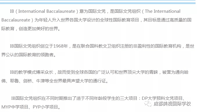 IB國際文憑組織創(chuàng)立于1968年,是在聯(lián)合國科教文衛(wèi)組織注冊的非盈利性的國際教育機構,是世界公認的國際教育的領跑者