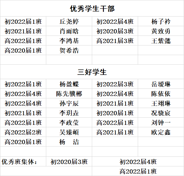 經(jīng)兩輪張榜后,學(xué)校評優(yōu)領(lǐng)導(dǎo)小組充分聽取各方意見并結(jié)合學(xué)生學(xué)習(xí)、管理、常規(guī)等方面表現(xiàn),研究決定推薦以下20位同學(xué)參評高新區(qū)優(yōu)秀學(xué)生干部、三好學(xué)生及3個優(yōu)秀班集體,特此榜示!