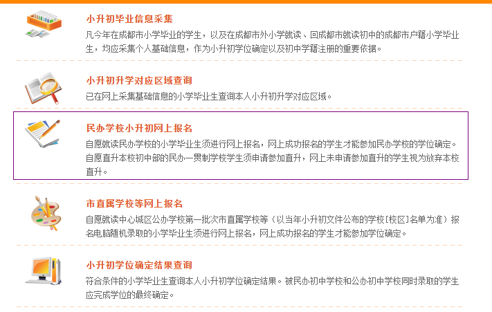 1、登陸“成都市小升初服務(wù)平臺”后,選擇“民辦學(xué)校小升初網(wǎng)上報名”。