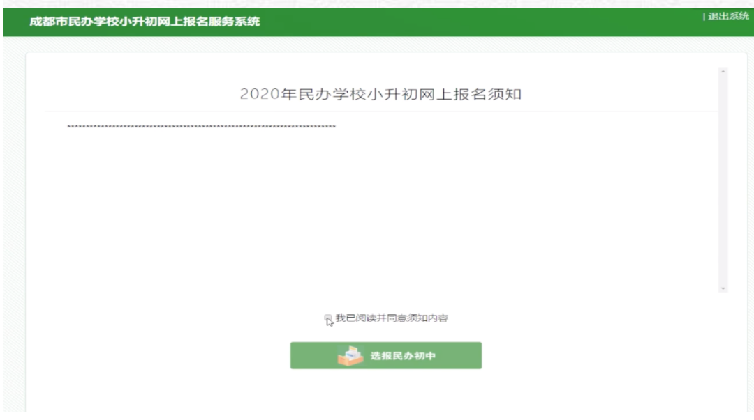 2、請仔細(xì)閱讀 “2020年民辦學(xué)校小升初網(wǎng)上報名須知”內(nèi)容。閱讀完畢后勾選“我已閱讀并同意須知內(nèi)容”,并點擊“填報民辦初中”。