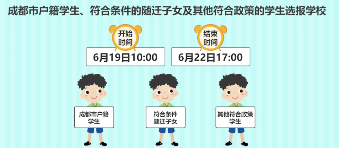 2020年6月19日10:00-6月22日17:00,成都市戶籍學(xué)生、符合條件的隨遷子女及其他符合政策的學(xué)生進(jìn)行民辦初中網(wǎng)上報名。