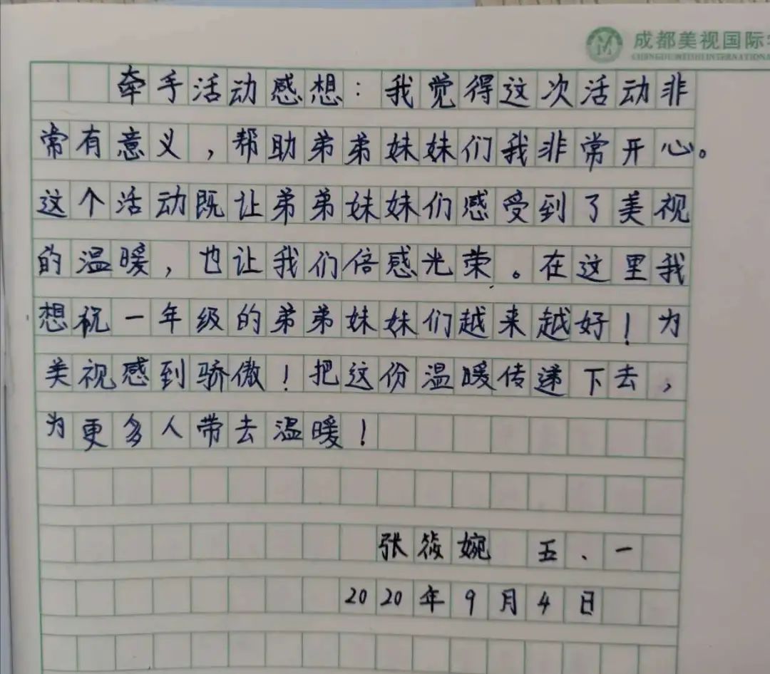 當(dāng)我牽著妹妹時,就會想起媽媽爸爸就是這樣拉著我的小手第一次走進校園的情景。五年過去了,我從懵懂逐漸自立,愿人與人之間的關(guān)愛在美視繼續(xù)傳承。希望學(xué)弟學(xué)妹們,不僅能在美視學(xué)到知識,還懂得會做人。