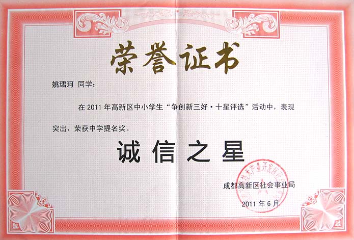 中學部姚珺珂同學在高新區(qū)“爭創(chuàng)新三好.十星評選”活動中榮獲誠信之星稱號