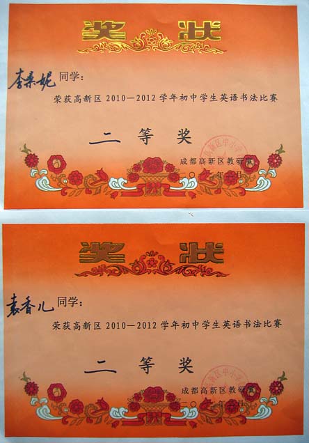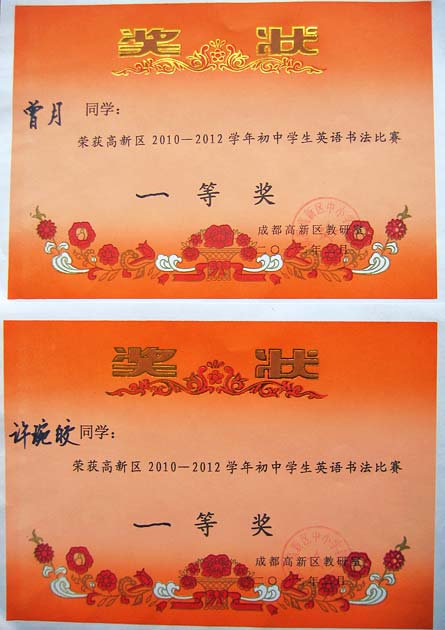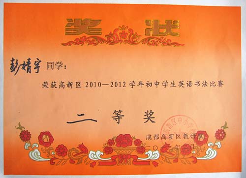 美視學(xué)子榮獲高新區(qū)2010--2012學(xué)年初中生英語書法比賽一、二等獎