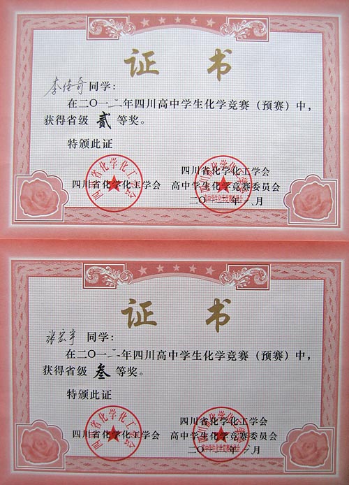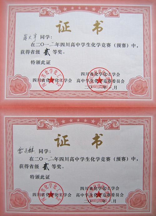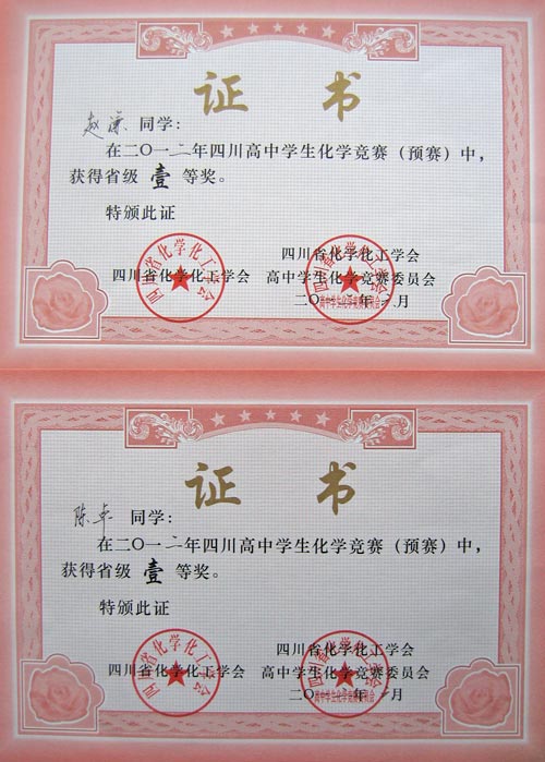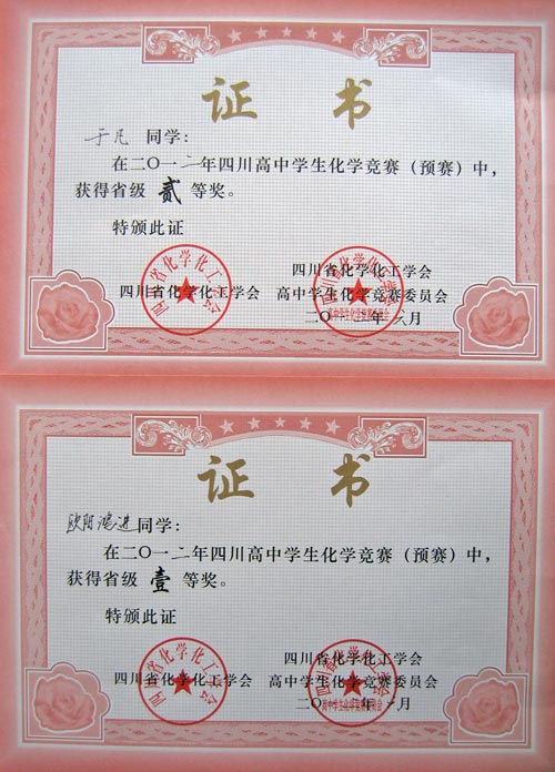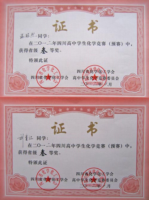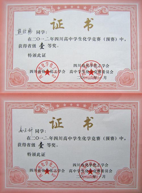 祝賀美視學子在2012年四川高中學生化學競賽(預賽)中獲獎