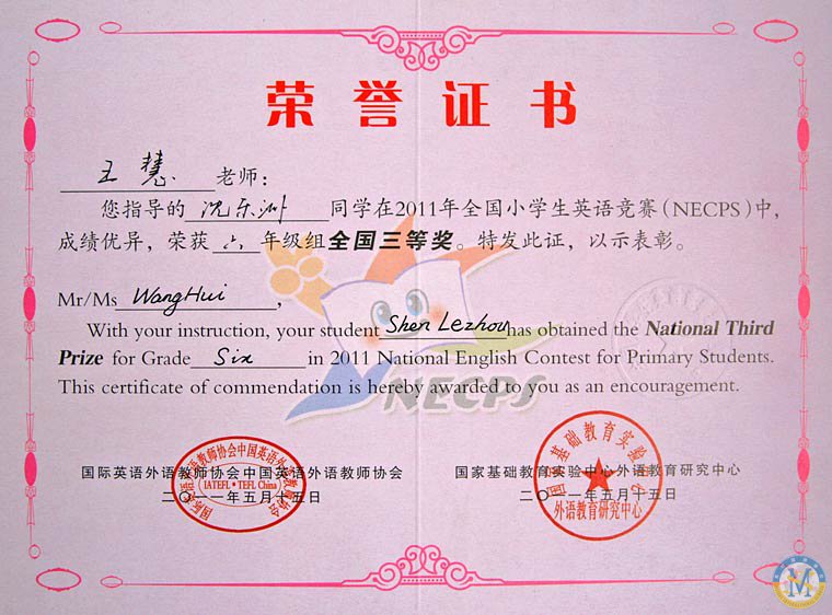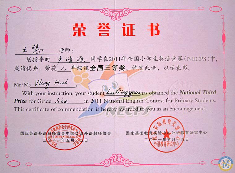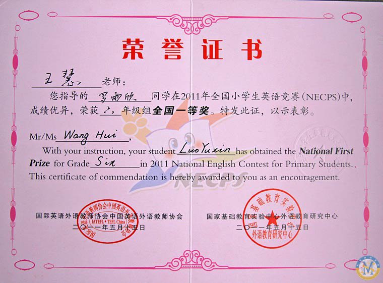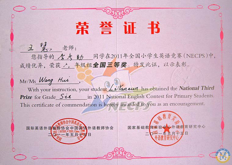 在2011年全國小學(xué)生英語競賽中,王慧老師指導(dǎo)學(xué)生盧清源、沈樂洲、李彥勛榮獲全國三等獎,羅雨欣同學(xué)獲全國一等獎。