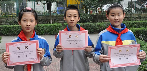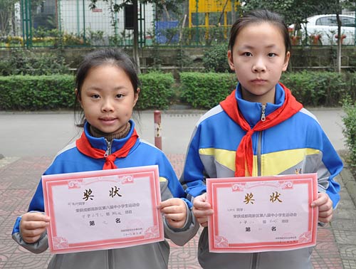 ▲ 柯雨萱、蔣雨橋、羅梓寧同學(xué)-榮獲成都市高新區(qū)第八屆中小學(xué)生運(yùn)動(dòng)會(huì)女子小乙組實(shí)心球比賽第八名