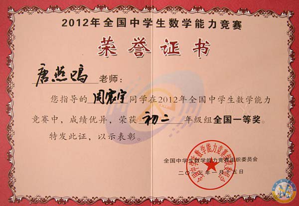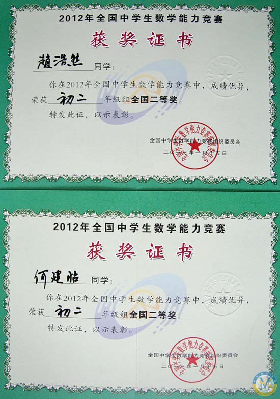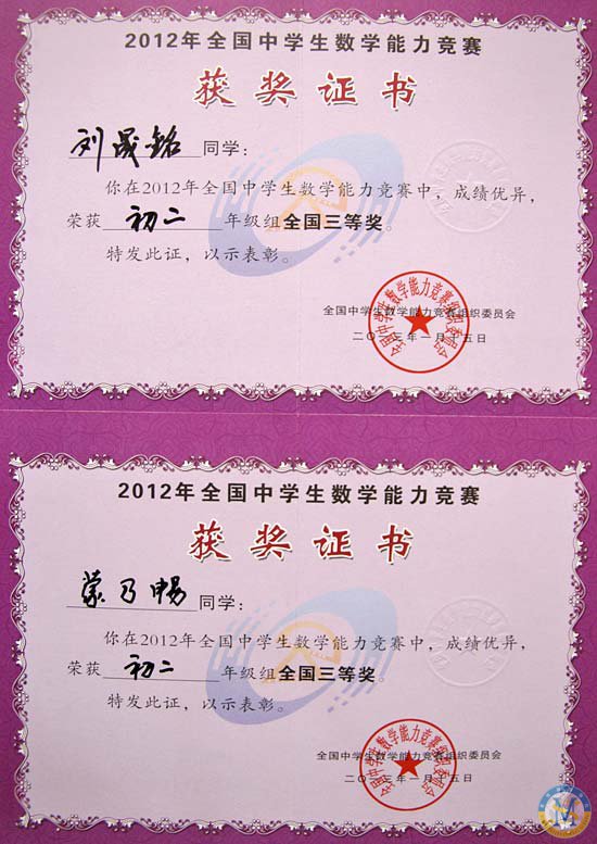 祝賀美視中學(xué)部學(xué)子在2012年全國中學(xué)生數(shù)學(xué)能力競賽中獲獎
