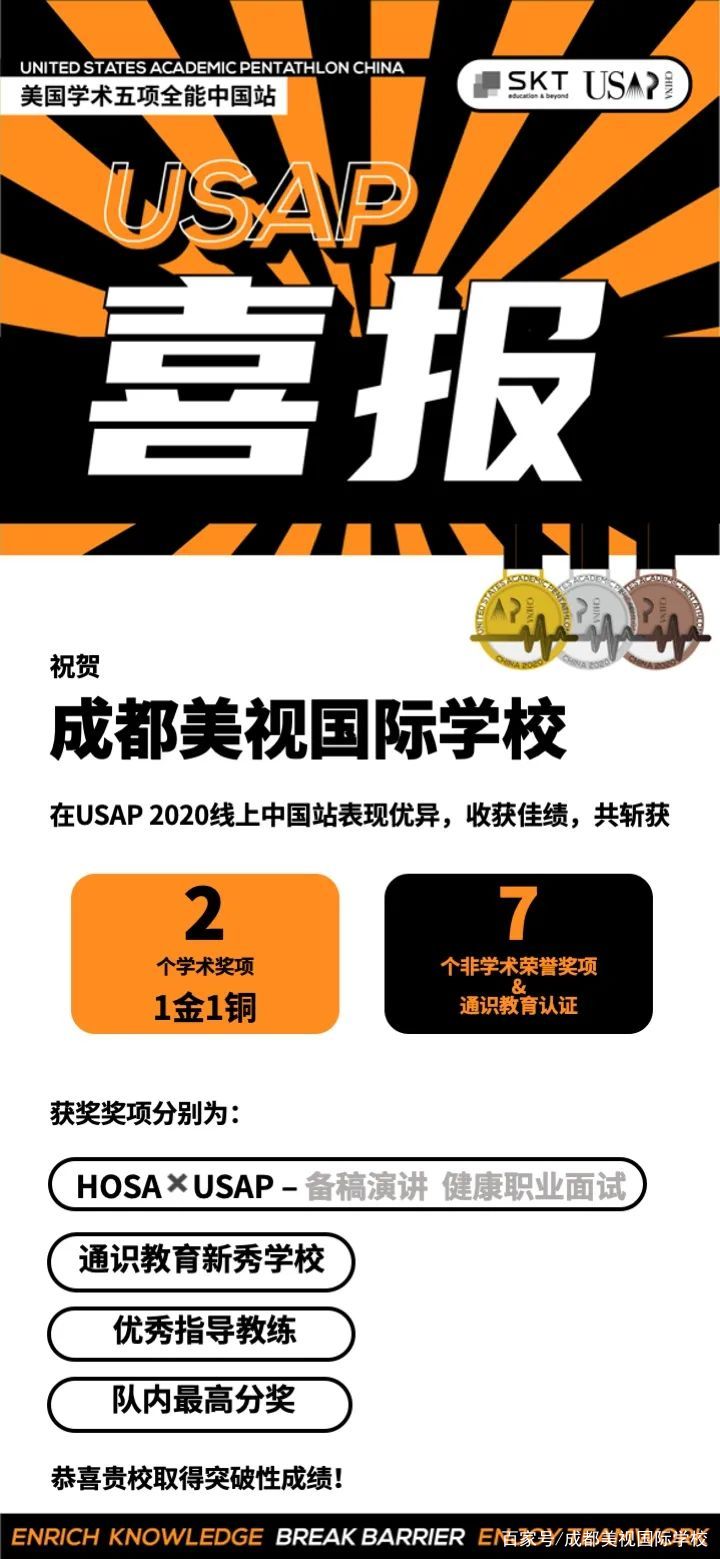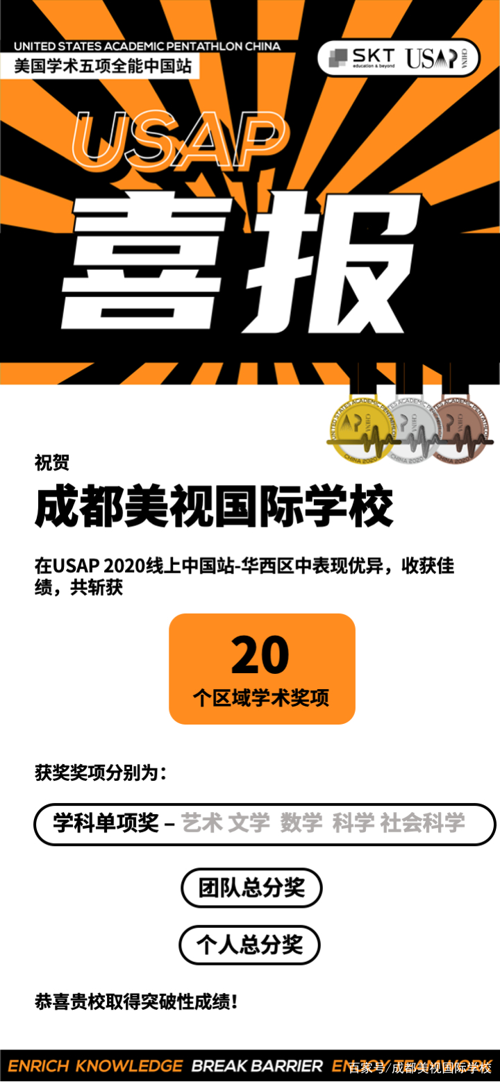 4月19日,2020美國學(xué)術(shù)五項全能中國站United States Academic Pentathlon(USAP)China 2020圓滿落下帷幕。由于疫情原因,原定在成都舉行的USAP賽事首次采取了線上競賽的方式。這次由融合部初中年級同學(xué)組成的美視學(xué)校代表隊表現(xiàn)優(yōu)異,初次參賽就取得了驕人的成績。包括全國范圍的2個學(xué)術(shù)獎項和7個非學(xué)術(shù)榮譽和通識教育認證,以及20個區(qū)域?qū)W術(shù)獎項,包括學(xué)科單項獎、團隊總分獎和個人總分獎,我校的指導(dǎo)老師團隊獲得了“優(yōu)秀指導(dǎo)教練獎”,除此之外,我校還獲得了“通識教育新秀學(xué)校獎”。更值得祝賀的是,我校首次出戰(zhàn),就獲得了華西區(qū)域總分第二名的優(yōu)異成績,無疑是對學(xué)校以及師生們的極大鼓舞。