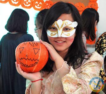2012年10月27日上午10點,中美英才班舉辦的萬圣節(jié)狂歡Party拉開了帷幕。英才班學生迫不及待的把自己裝扮起來,有巫女裝,貓女裝,蜘蛛俠裝扮等等;同學們帶著千奇百怪的面具,手提“杰克燈”,呈現(xiàn)出一派“鬼”趣十足的派對氛圍。本次Party分為幾個環(huán)節(jié),如萬圣節(jié)來歷, 木乃伊裝扮,“不給糖就搗蛋”,“鬼片”賞析等。同學們在狂歡的同時,也領略了西方國家這一傳統(tǒng)節(jié)日的精髓。