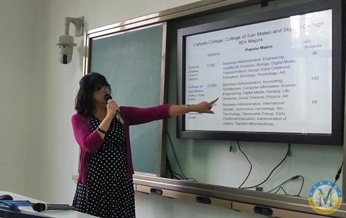 圣馬特奧聯(lián)合學(xué)院坐落在美國(guó)加州圣馬特奧山上,環(huán)境優(yōu)美,氣候宜人。圣馬特奧聯(lián)合學(xué)院由三所社區(qū)學(xué)院組成: Cañada College 肯爾那達(dá)學(xué)院 College of San Mateo 圣馬特奧學(xué)院 Skyline College 斯凱蘭學(xué)院。2013年10月9日,該學(xué)院國(guó)際教育部的Diane Arguijo 和中國(guó)區(qū)代表Greg Chen為中美英才班學(xué)生詳細(xì)講解了學(xué)校地理位置,優(yōu)勢(shì)專業(yè),2+2項(xiàng)目,以及學(xué)費(fèi)等學(xué)生關(guān)心的問(wèn)題。講座后,Diane 和Greg 還一一解答了學(xué)生的提問(wèn)。
