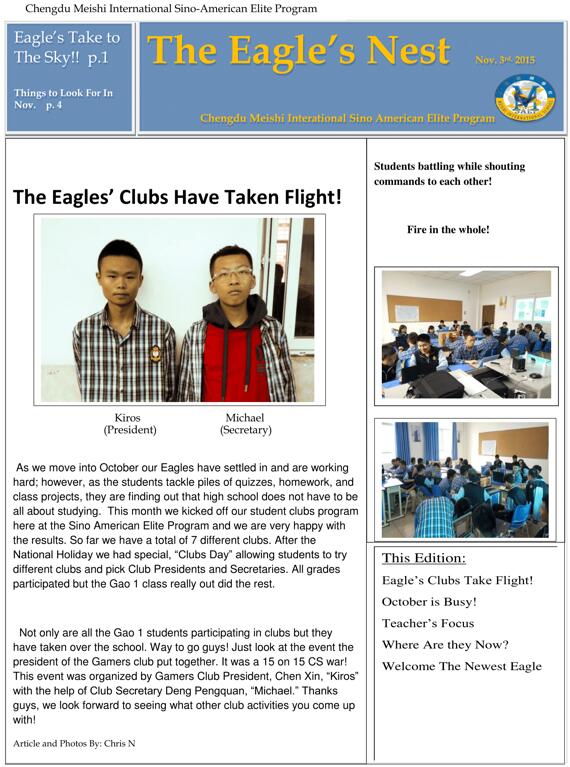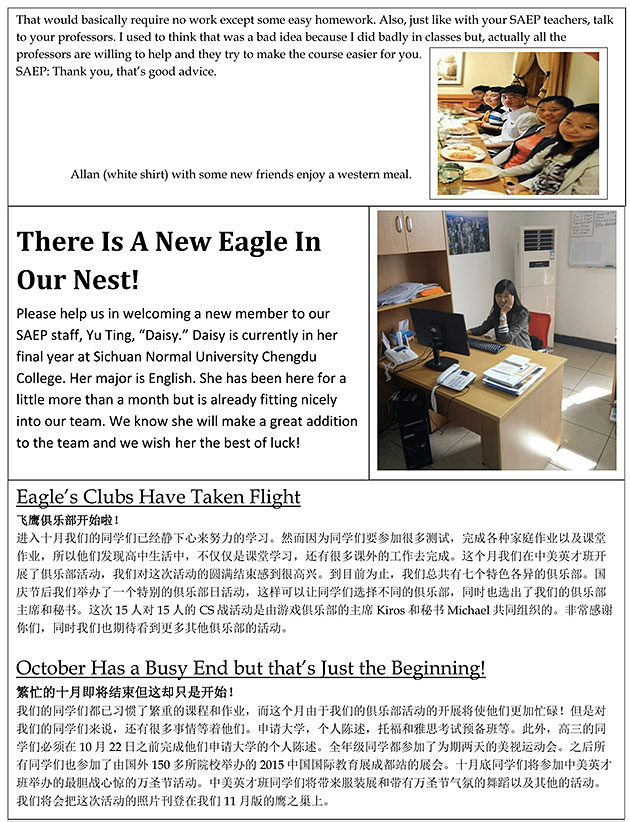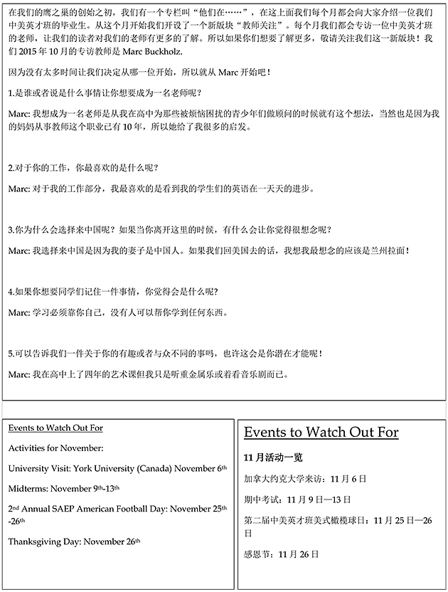 我們的同學們都已習慣了繁重的課程和作業(yè),而這個月由于我們的俱樂部活動的開展將使他們更加忙碌!但是對我們的同學們來說,還有很多事情等著他們。申請大學,個人陳述,托福和雅思考試預備班等。此外,高三的同學們必須在1022日之前完成他們申請大學的個人陳述。全年級同學都參加了為期兩天的美視運動會。之后所有同學們也參加了由國外150多所院校舉辦的2015中國國際教育展成都站的展會。十月底同學們將參加中美英才班舉辦的最膽戰(zhàn)心驚的萬圣節(jié)活動。中美英才班同學們將帶來服裝展和帶有萬圣節(jié)氣氛的舞蹈以及其他的活動。我們將會把這次活動的照片刊登在我們11月版的鷹之巢上。