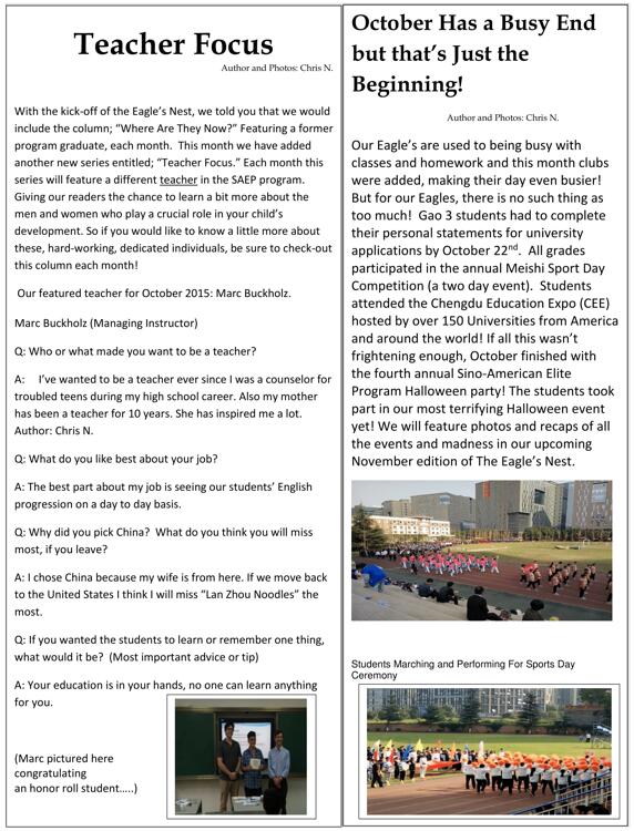 在我們的鷹之巢的創(chuàng)始之初,我們有一個專欄叫“他們在……”,在這上面我們每個月都會向大家介紹一位我們中美英才班的畢業(yè)生。從這個月開始我們開設了一個新版塊“教師關注”。每個月我們都會專訪一位中美英才班的老師,讓我們的讀者對我們的老師有更多的了解。所以如果你們想要了解更多,敬請關注我們這一新版塊!我們201510月的專訪教師是Marc Buckholz.