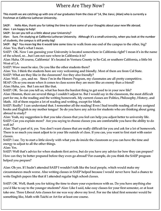 本月我們訪問到了來自2014屆的畢業(yè)生Alan佘家瑞,他現在是加州路德大學的一名大一新生。