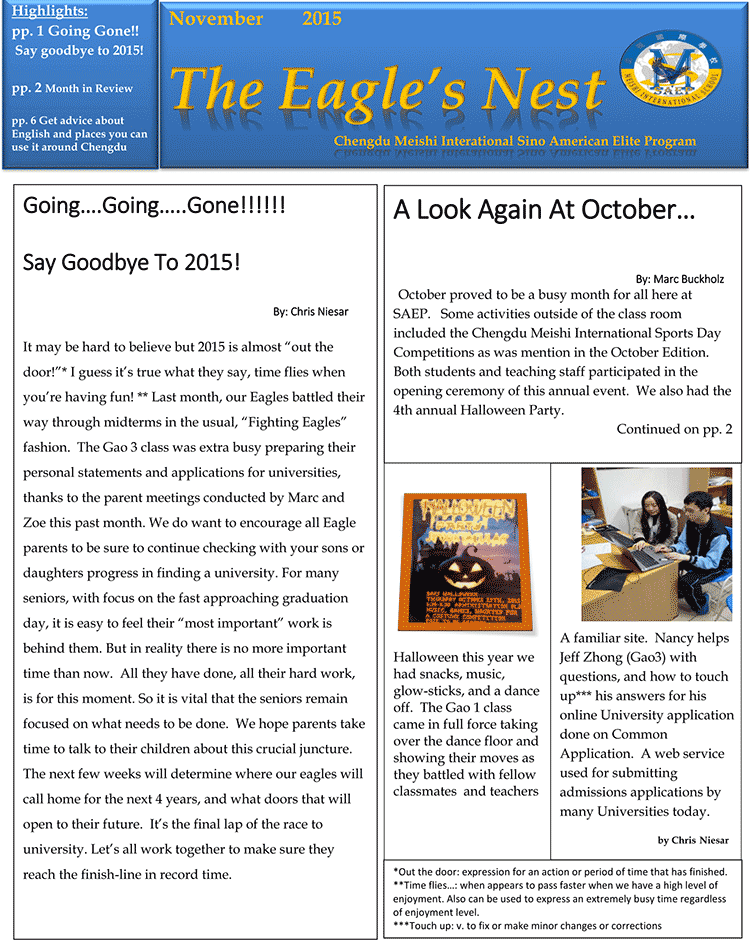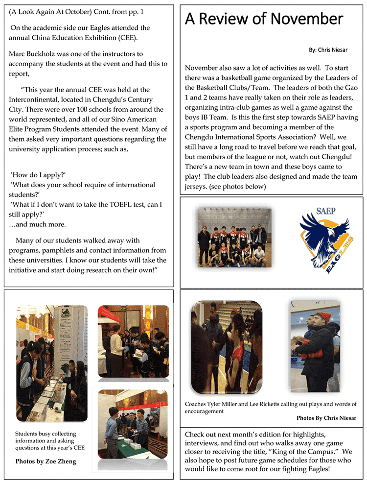對(duì)于中美英才班來(lái)說(shuō),十月充滿著忙碌的氣息。在10月版的鷹之巢上我們談到了一些課外活動(dòng),其中包括成都美視學(xué)校的運(yùn)動(dòng)會(huì)。同學(xué)們和老師們都參加了運(yùn)動(dòng)會(huì)開(kāi)幕式。我們還舉辦了萬(wàn)圣節(jié)晚會(huì)。此外我們的同學(xué)也參加了中國(guó)教育展成都站的展會(huì),此次展會(huì)有來(lái)自美國(guó)和全世界300多家的大學(xué)供同學(xué)們了解參觀,這對(duì)同學(xué)們的大學(xué)申請(qǐng)有很大的幫助。
