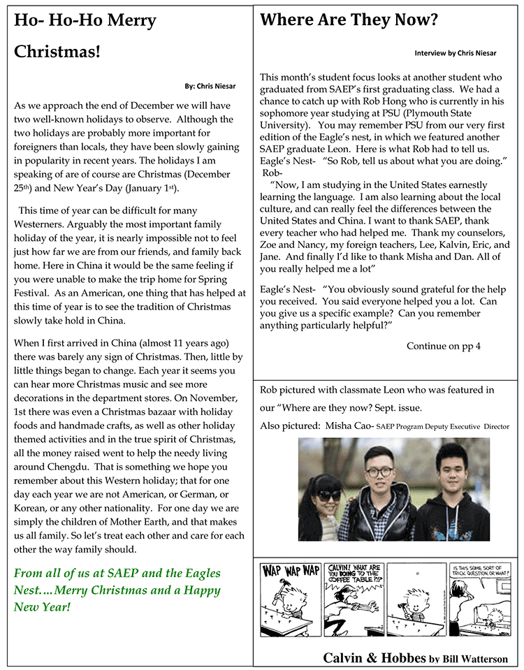 12月底,我們將會(huì)迎來(lái)大家熟知的兩個(gè)節(jié)日。盡管這兩個(gè)節(jié)日可能外國(guó)人會(huì)比當(dāng)?shù)厝烁又匾暋5┠陙?lái),這兩個(gè)節(jié)日也逐漸變得流行起來(lái)。我所說(shuō)的兩個(gè)節(jié)日是1225日的圣誕節(jié)和11日的元旦節(jié)。每年這個(gè)時(shí)候?qū)τ谠S多西方人來(lái)說(shuō)都是難熬的,因?yàn)闀?huì)不可避免的思念家鄉(xiāng),就如在春節(jié)時(shí)不能回家的中國(guó)人一樣,他們對(duì)此也會(huì)感同身受。作為一名外國(guó)人,見(jiàn)證了圣誕節(jié)的傳統(tǒng)在中國(guó)慢慢地扎根。大約是11年前,當(dāng)我第一次來(lái)中國(guó)時(shí),幾乎看不到任何關(guān)于圣誕節(jié)的東西。后來(lái),這種情況逐漸開(kāi)始轉(zhuǎn)變?,F(xiàn)在每年你都能聽(tīng)到圣誕節(jié)音樂(lè),看到有著圣誕節(jié)裝飾的商場(chǎng)。在1114日當(dāng)天,甚至有一個(gè)圣誕節(jié)義賣市場(chǎng)。除此以外還有節(jié)日大餐、手工藝品和節(jié)日主題活動(dòng)。并且所有籌集的錢都用于居住在成都周圍需要幫助的人們,這正體現(xiàn)了圣誕節(jié)真正的精神。對(duì)于圣誕節(jié),它蘊(yùn)含的真正精神就是我們希望你能記住的。在每年的這一天中,我們不分彼此,不分國(guó)籍。所以讓我們將彼此以家人相待。