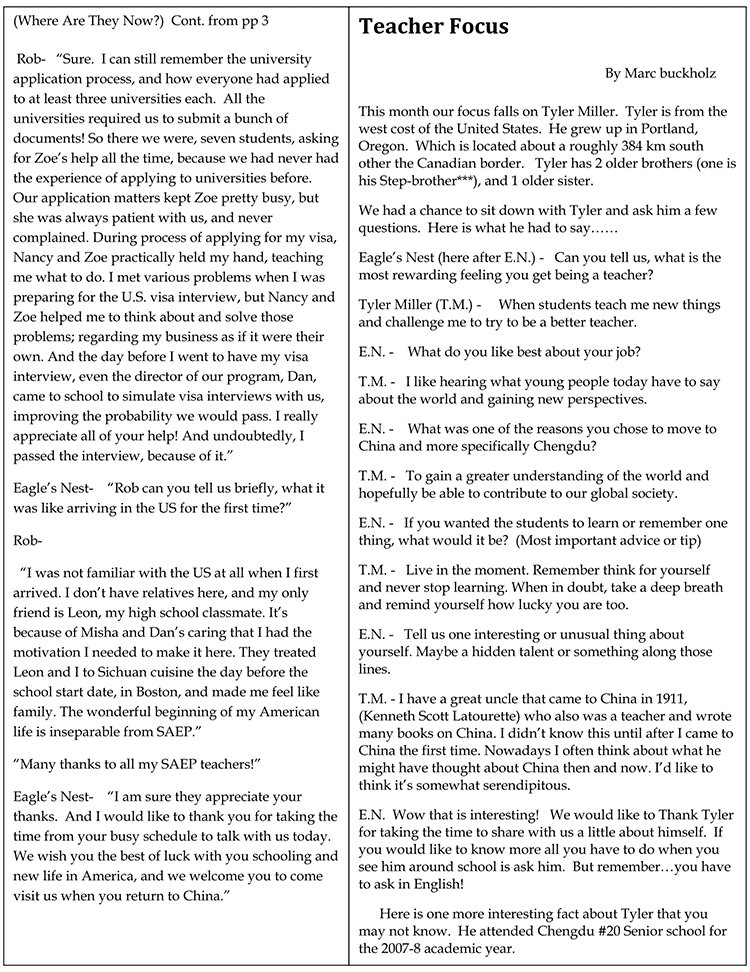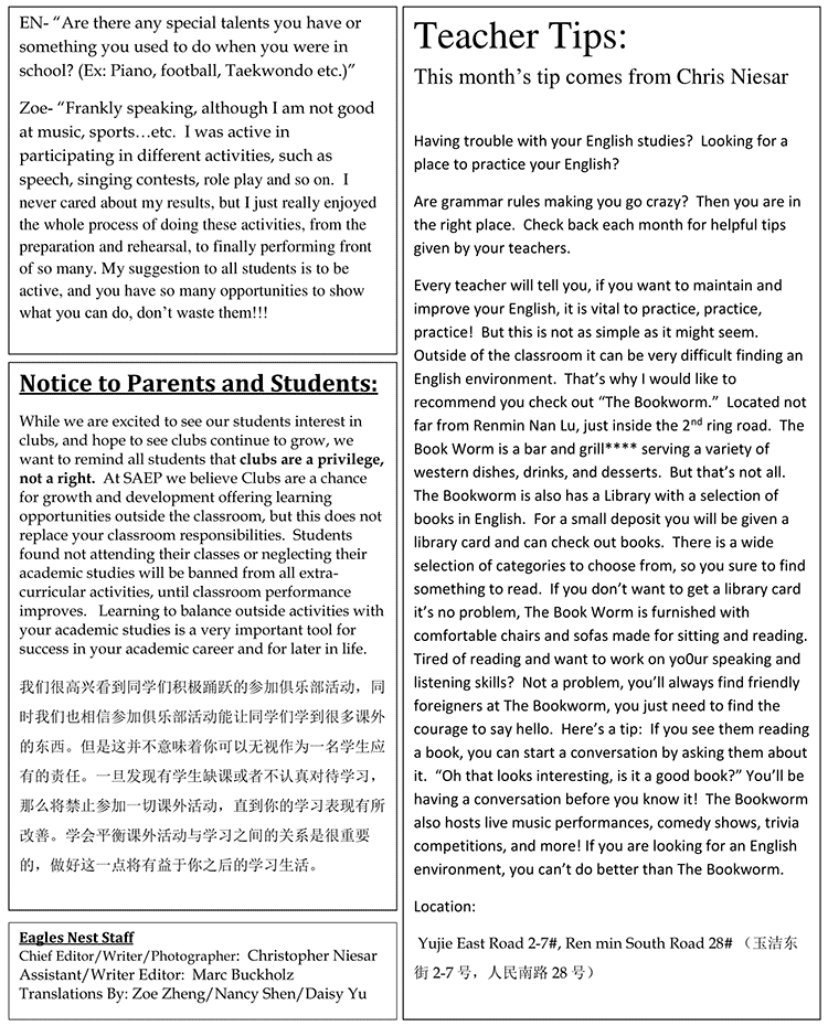 鷹之巢:哇哦,真是有趣!我們很感謝Tyler能夠抽出時(shí)間來(lái)與我們分享關(guān)于他的故事。如果你對(duì)他想要有更多的了解,可以在學(xué)校遇見(jiàn)他的時(shí)候問(wèn)他,但要記住的是必須用英語(yǔ)。
