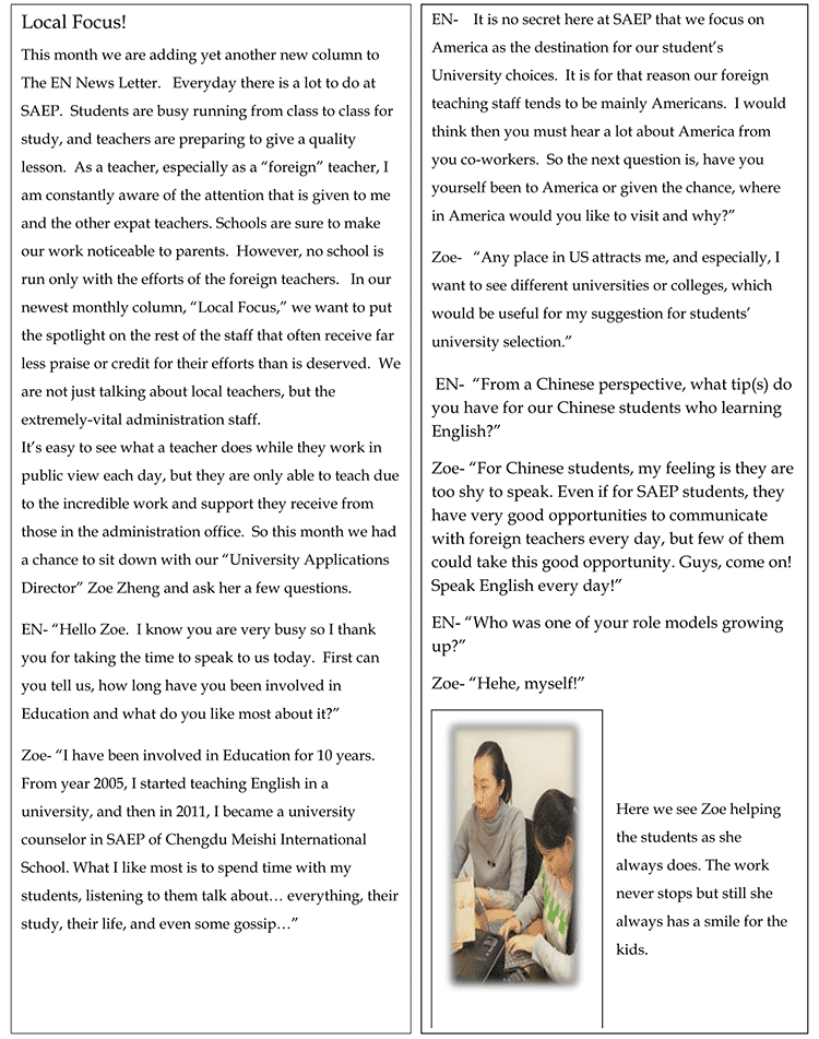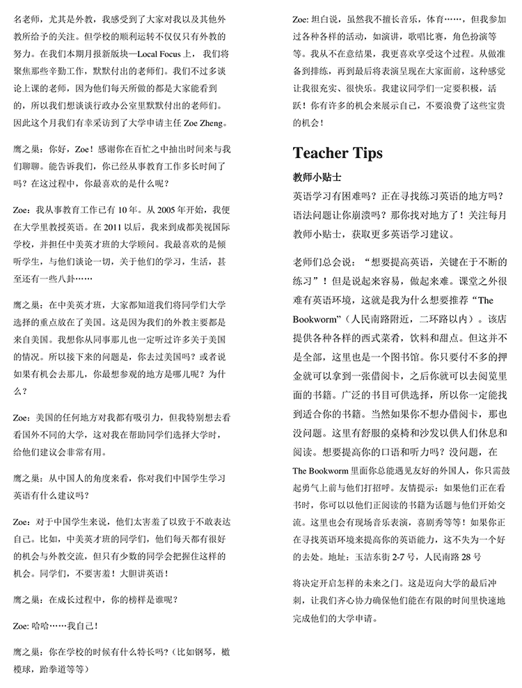 在本期鷹之巢月報(bào)上,我們又新加入了一個(gè)版塊—Local Focus. 每天同學(xué)們都在忙碌地學(xué)習(xí),與此同時(shí)老師們也保證做足準(zhǔn)備以便為同學(xué)們提供高質(zhì)量的課程。作為一名老師,尤其是外教,我感受到了大家對(duì)我以及其他外教所給予的關(guān)注。但學(xué)校的順利運(yùn)轉(zhuǎn)不僅僅只有外教的努力。在我們本期月報(bào)新版塊—Local Focus上, 我們將聚焦那些辛勤工作,默默付出的老師們。我們不過(guò)多談?wù)撋险n的老師,因?yàn)樗麄兠刻焖龅亩际谴蠹夷芸吹降模晕覀兿胝務(wù)勑姓k公室里默默付出的老師們。因此這個(gè)月我們有幸采訪到了大學(xué)申請(qǐng)主任Zoe Zheng。